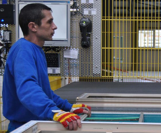 Photo de la main d'un opérateur sur ligne caressant le profil pvc d'une fenêtre en cours de fabrication dans l'usine