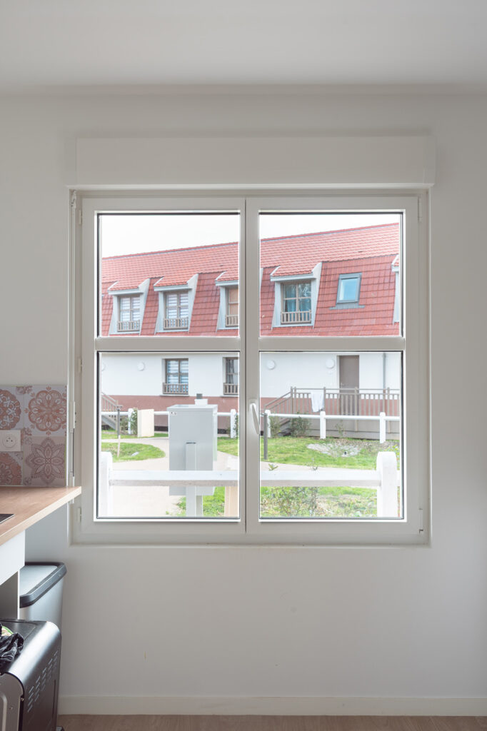 Fenêtre mixte ALYA vue depuis l’intérieur d’un studio de la Résidence de l’Hippodrome au Touquet, mise en œuvre AMCC.